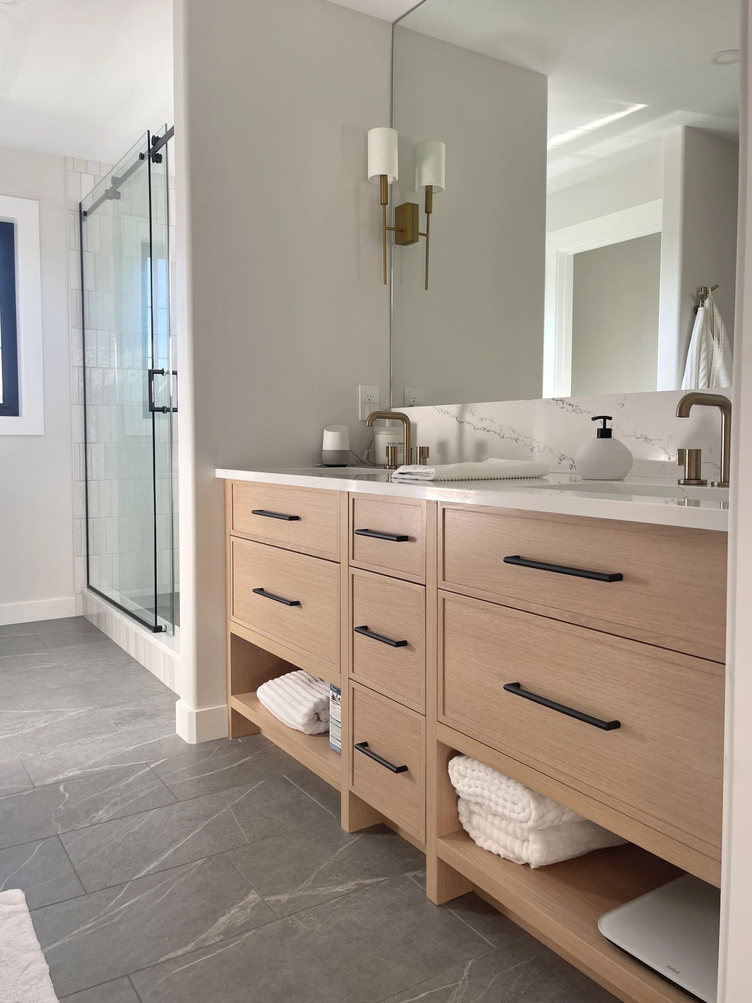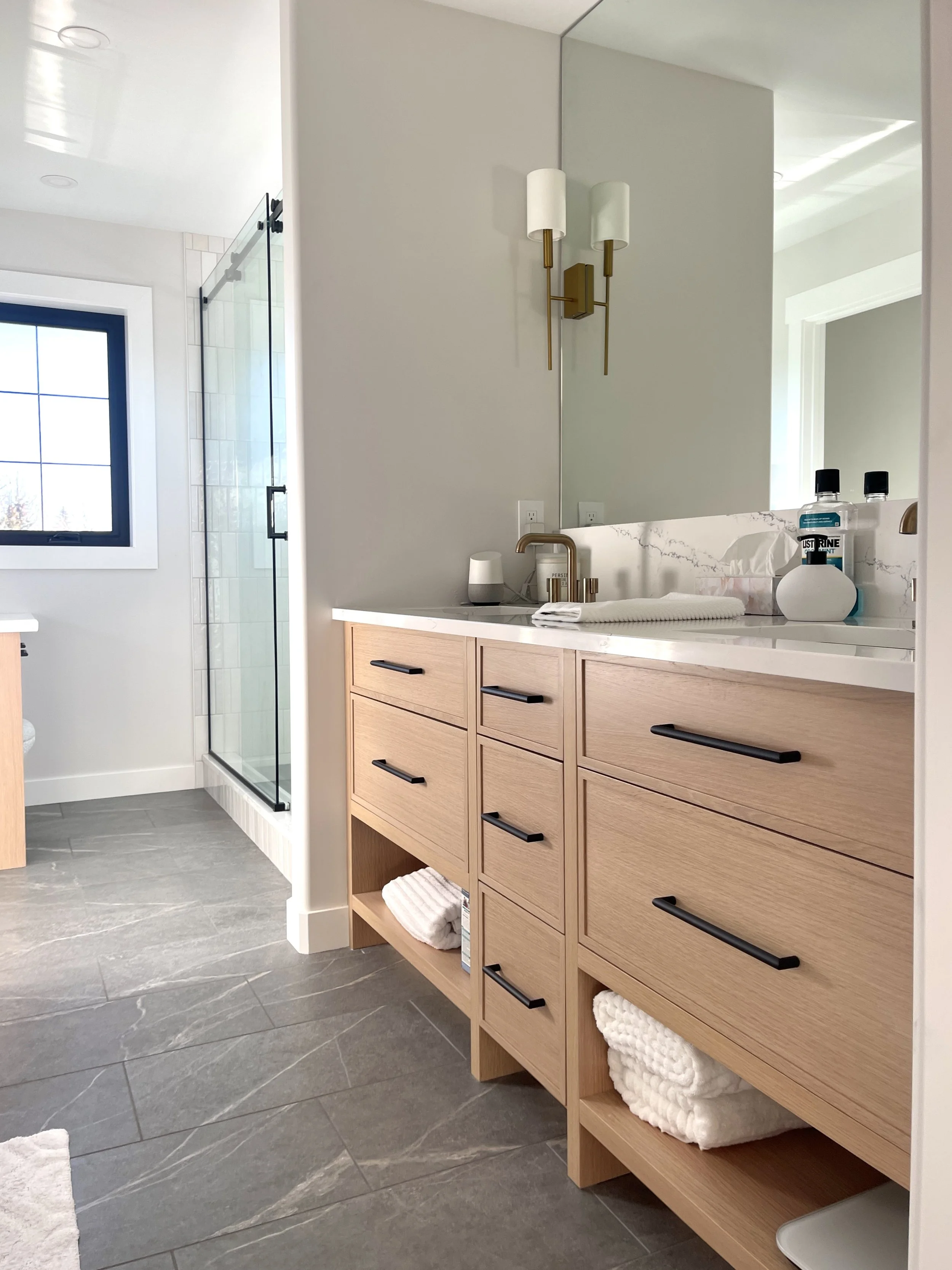 Materiality played a key role in creating the tranquil atmosphere: warm wood cabinetry, tactile stone floor tiles, and artisan-crafted shower wall tiles work in harmony, while sleek, modern fixtures bring a refined edge to the space.